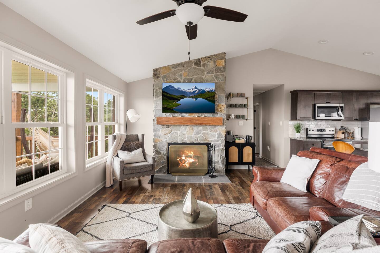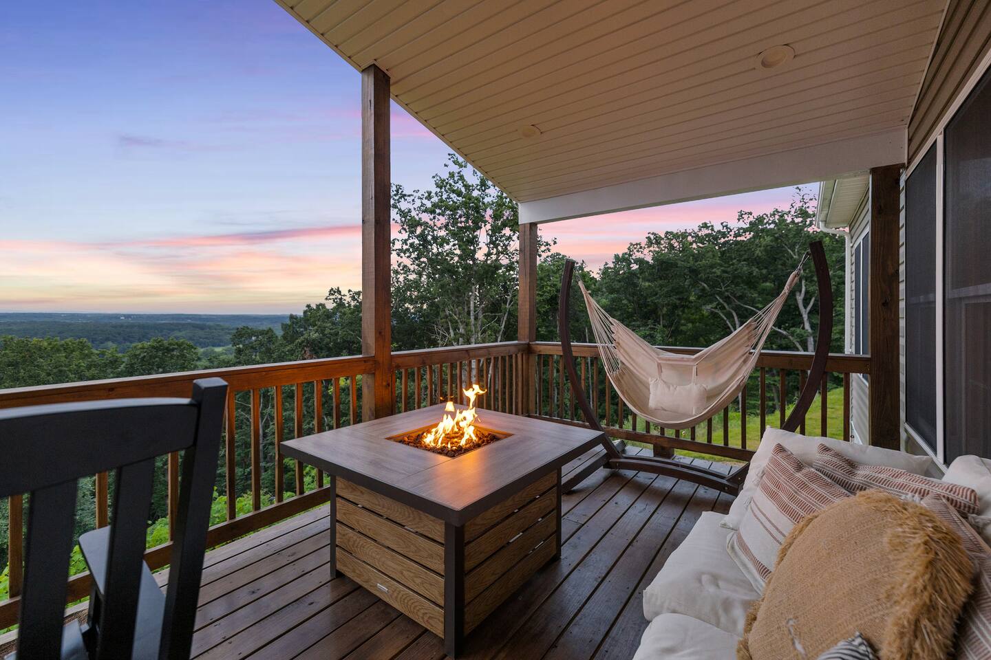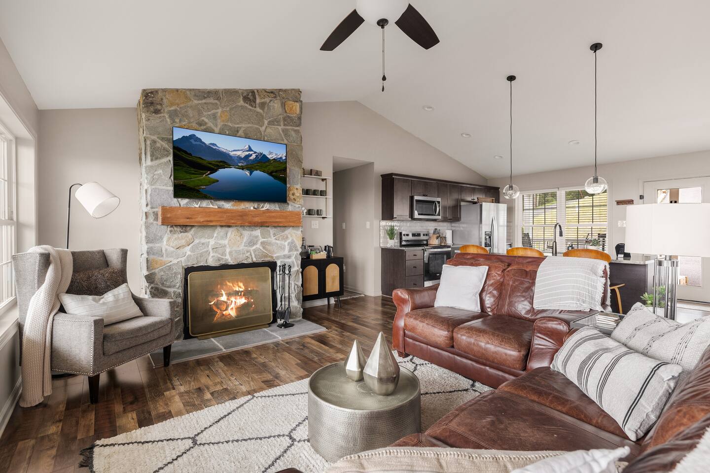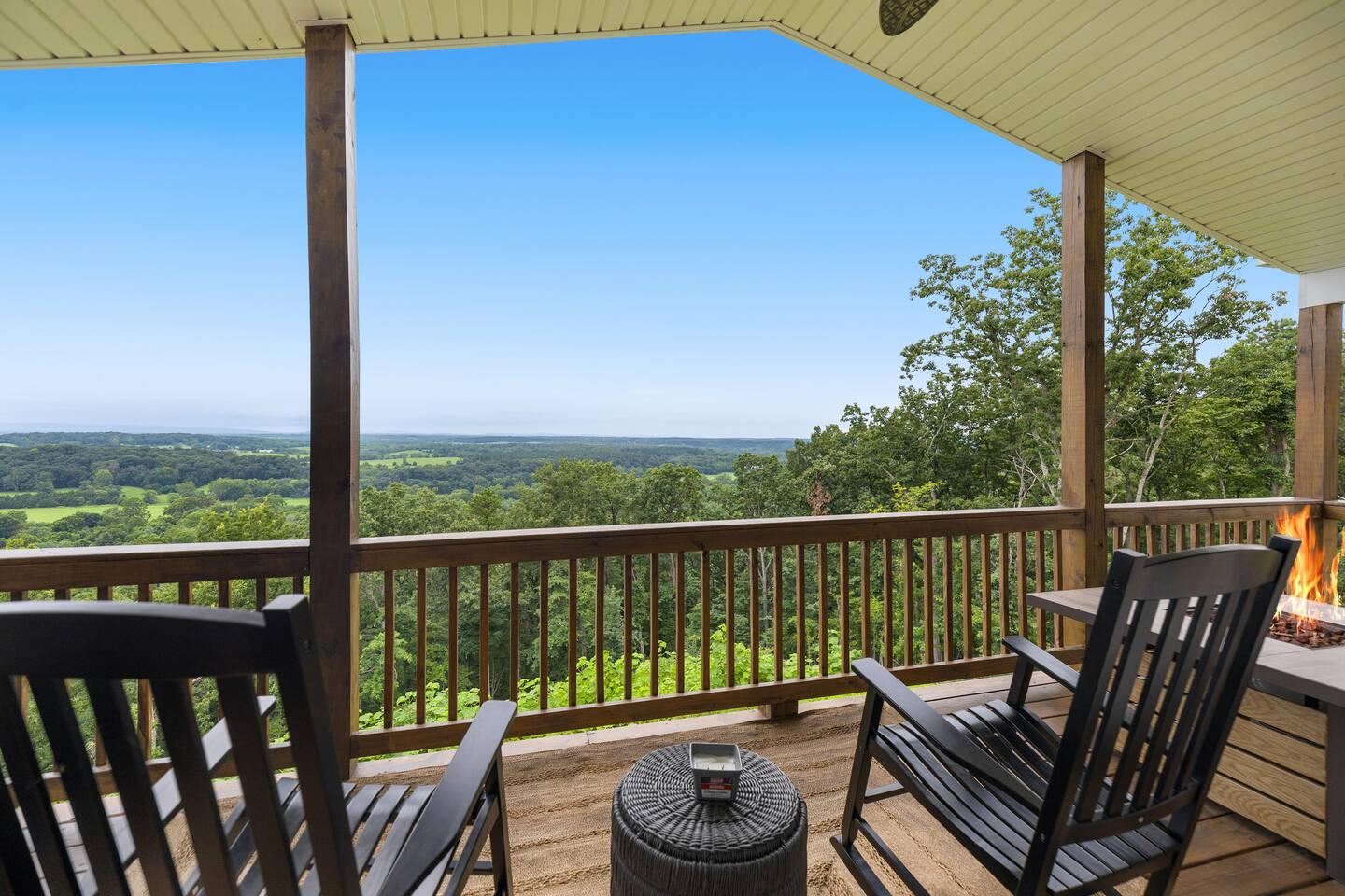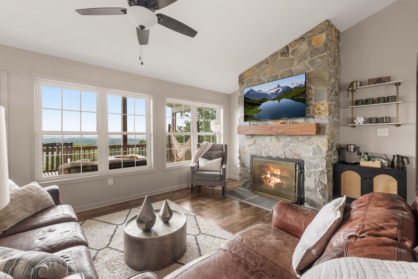 Welcome to The Vue in Front Royal, Virginia, a mountainside retreat designed for unforgettable stays above the Shenandoah Valley. Perched high on the mountain overlooking the Shenandoah River, this private getaway offers breathtaking panoramic views, peaceful surroundings, and the perfect setting for relaxation, adventure, and time spent with family or friends. Whether you’re planning a quiet weekend escape, a group getaway, or an extended stay to explore the valley, The Vue offers comfort, scenery, and privacy in one of the most beautiful areas of Virginia. Reaching the home is part of the experience. A winding dirt road climbs gradually through the forest, creating a sense of leaving the busy world behind as you approach the property. When you arrive, the reward is immediate. The home sits high above the valley with sweeping views of the Shenandoah River and the rolling mountains beyond. From sunrise lighting the ridge lines to golden sunsets across the valley floor, the scenery provides an ever-changing backdrop that makes every moment here feel special. The home is designed to make relaxing and gathering easy. Large windows bring the outside in, filling the living areas with natural light and framing the stunning mountain views. Open, comfortable living spaces provide plenty of room for guests to unwind, share meals, and spend time together after a day exploring the region. Whether you’re enjoying morning coffee while watching mist rise from the river or ending the evening with quiet conversation as the sun sets behind the mountains, the setting encourages you to slow down and enjoy the moment. Accessibility and convenience were carefully considered in the layout of the home. The front entry is wheelchair accessible, allowing guests to enter comfortably without steps. Three of the four bedrooms are located on the main floor, making it easier for guests who prefer to avoid stairs while still providing plenty of space and privacy for everyone in the group. The thoughtful design allows guests of all ages and mobility levels to feel comfortable and at ease throughout their stay. Step outside and the experience becomes even more memorable. A private hot tub offers the perfect place to relax while taking in the incredible views of the valley and surrounding mountains. After a day hiking, kayaking, or exploring local wineries, there is nothing better than soaking in the warm water while the sun sets over the Shenandoah landscape. At night, the mountain air becomes quiet and still, and the stars above the valley create a peaceful and unforgettable atmosphere. While the home feels secluded and tucked away in the mountains, the town of Front Royal is only a short drive away. Guests can easily visit local restaurants, shops, grocery stores, and cafes while still returning to the privacy and tranquility of the mountain retreat at the end of the day. This unique balance of seclusion and convenience is one of the things that makes The Vue such a special place to stay. Front Royal is known as the northern gateway to Shenandoah National Park and Skyline Drive, making it a perfect destination for outdoor adventures. Guests can spend their days hiking scenic trails, kayaking or tubing on the Shenandoah River, visiting nearby vineyards and breweries, or taking one of the most beautiful scenic drives in the country. Every season brings its own charm, from vibrant fall foliage to peaceful winter mountain views. Whether you are here for outdoor adventure, quiet relaxation, or time spent reconnecting with friends and family, The Vue provides a setting that makes every stay feel memorable. With incredible views, comfortable living spaces, wheelchair-accessible entry, three main-level bedrooms, and a private hot tub overlooking the valley, this mountain retreat offers an unforgettable Shenandoah Valley experience for every guest who arrives.
