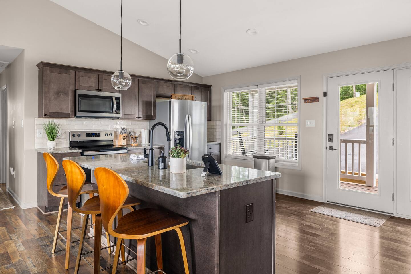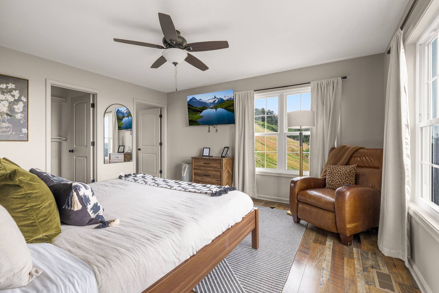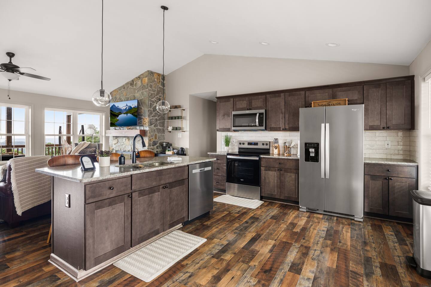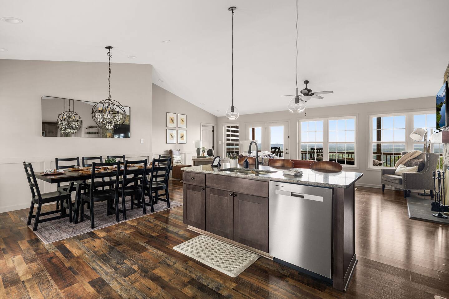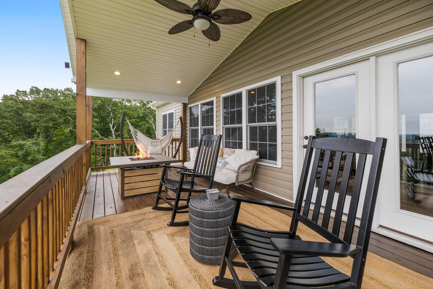 Welcome to The Vue in Front Royal, Virginia, a mountainside retreat designed for unforgettable stays above the Shenandoah Valley. Perched high on the mountain overlooking the Shenandoah River, this private getaway offers breathtaking panoramic views, peaceful surroundings, and the perfect setting for relaxation, adventure, and time spent with family or friends. Whether you’re planning a quiet weekend escape, a group getaway, or an extended stay to explore the valley, The Vue offers comfort, scenery, and privacy in one of the most beautiful areas of Virginia. Reaching the home is part of the experience. A winding dirt road climbs gradually through the forest, creating a sense of leaving the busy world behind as you approach the property. When you arrive, the reward is immediate. The home sits high above the valley with sweeping views of the Shenandoah River and the rolling mountains beyond. From sunrise lighting the ridge lines to golden sunsets across the valley floor, the scenery provides an ever-changing backdrop that makes every moment here feel special. The home is designed to make relaxing and gathering easy. Large windows bring the outside in, filling the living areas with natural light and framing the stunning mountain views. Open, comfortable living spaces provide plenty of room for guests to unwind, share meals, and spend time together after a day exploring the region. Whether you’re enjoying morning coffee while watching mist rise from the river or ending the evening with quiet conversation as the sun sets behind the mountains, the setting encourages you to slow down and enjoy the moment. Accessibility and convenience were carefully considered in the layout of the home. The front entry is wheelchair accessible, allowing guests to enter comfortably without steps. Three of the four bedrooms are located on the main floor, making it easier for guests who prefer to avoid stairs while still providing plenty of space and privacy for everyone in the group. The thoughtful design allows guests of all ages and mobility levels to feel comfortable and at ease throughout their stay. Step outside and the experience becomes even more memorable. A private hot tub offers the perfect place to relax while taking in the incredible views of the valley and surrounding mountains. After a day hiking, kayaking, or exploring local wineries, there is nothing better than soaking in the warm water while the sun sets over the Shenandoah landscape. At night, the mountain air becomes quiet and still, and the stars above the valley create a peaceful and unforgettable atmosphere. While the home feels secluded and tucked away in the mountains, the town of Front Royal is only a short drive away. Guests can easily visit local restaurants, shops, grocery stores, and cafes while still returning to the privacy and tranquility of the mountain retreat at the end of the day. This unique balance of seclusion and convenience is one of the things that makes The Vue such a special place to stay. Front Royal is known as the northern gateway to Shenandoah National Park and Skyline Drive, making it a perfect destination for outdoor adventures. Guests can spend their days hiking scenic trails, kayaking or tubing on the Shenandoah River, visiting nearby vineyards and breweries, or taking one of the most beautiful scenic drives in the country. Every season brings its own charm, from vibrant fall foliage to peaceful winter mountain views. Whether you are here for outdoor adventure, quiet relaxation, or time spent reconnecting with friends and family, The Vue provides a setting that makes every stay feel memorable. With incredible views, comfortable living spaces, wheelchair-accessible entry, three main-level bedrooms, and a private hot tub overlooking the valley, this mountain retreat offers an unforgettable Shenandoah Valley experience for every guest who arrives.